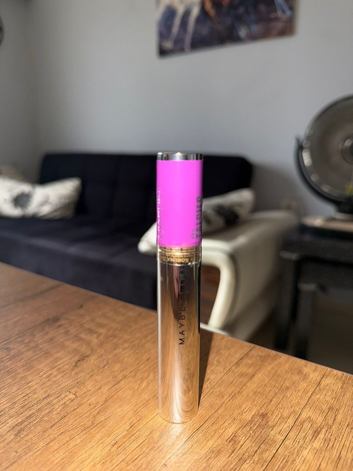 Maybelline markasının parlak mor renkli maskarası, kirpiklere canlı renk ve pürüzsüz uygulama sağlar.