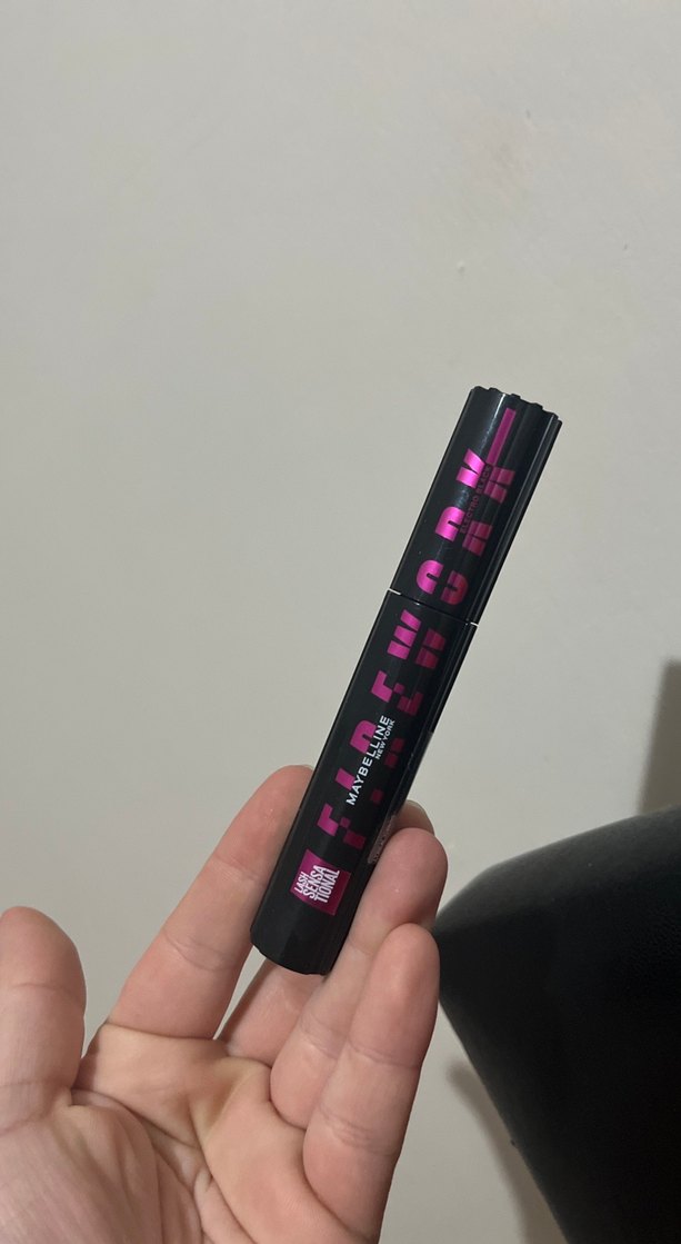 Maybelline maskara, koyu renk ve canlı pembe ambalajda. Kirpikleri yoğun renk ve hacimle belirginleştirir.