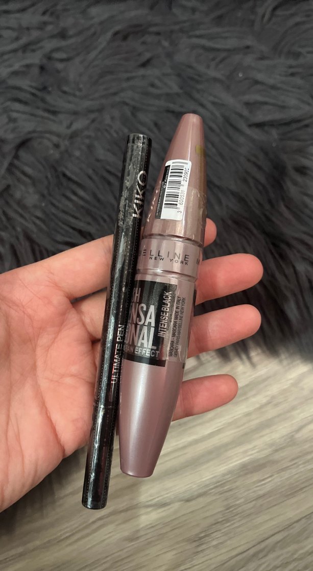 Bej renkli Maybelline Lash Sensational maskara ve Eyeliner içeren makyaj seti.