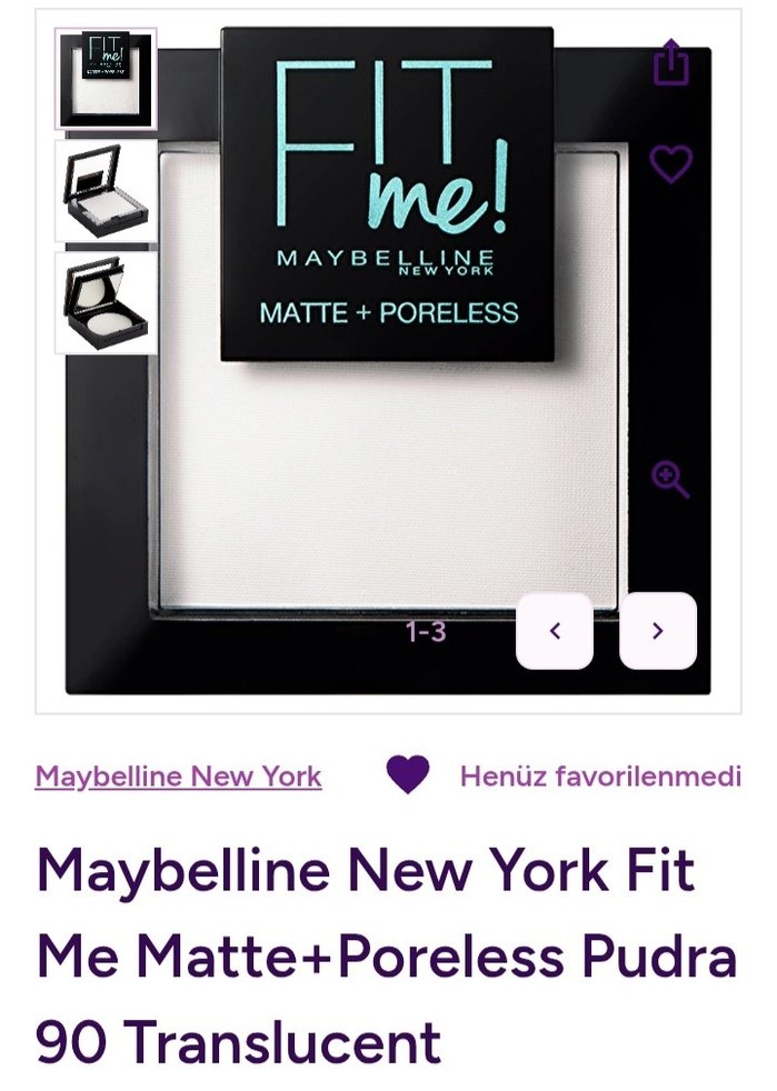 Maybelline New York Fit Me Matte+Poreless pudra 90 Translucent, mat ve gözeneksiz bir görünüm sağlar. Doğal bir bitiş için uygundur. Sadece düğün makyajı için iki kez kulandım