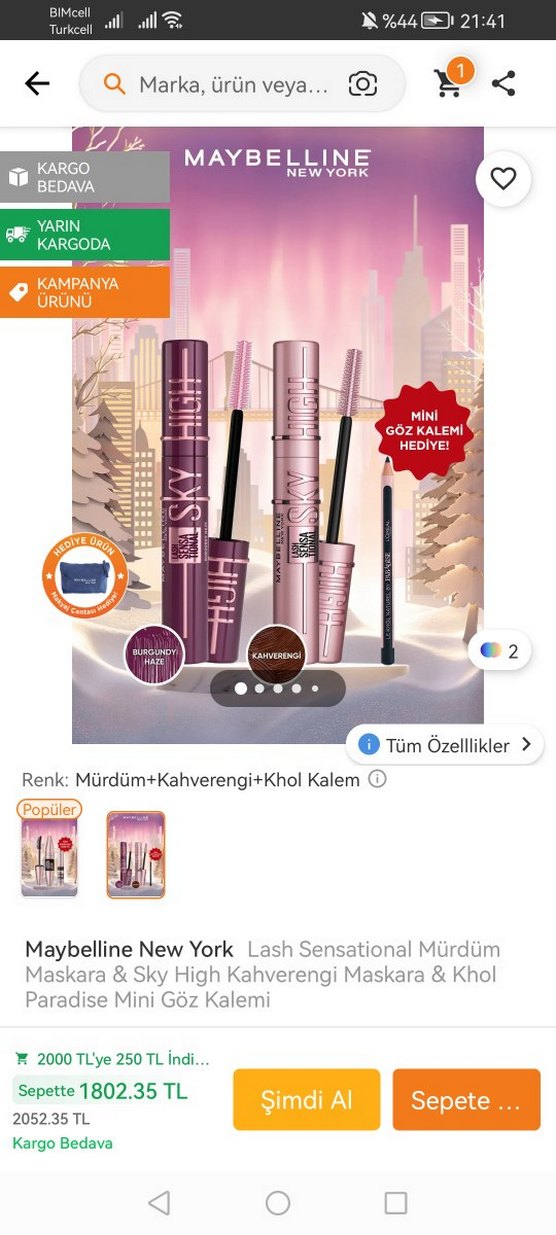 Maybelline New York setinde Lash Sensational mürdüm maskara, Sky High kahverengi maskara ve mini khol göz kalemi bulunur. Canlı renklerle hediye seti. Ürünü trendyoldan aldım orijinaldir hiç kullanılmadı sıfır