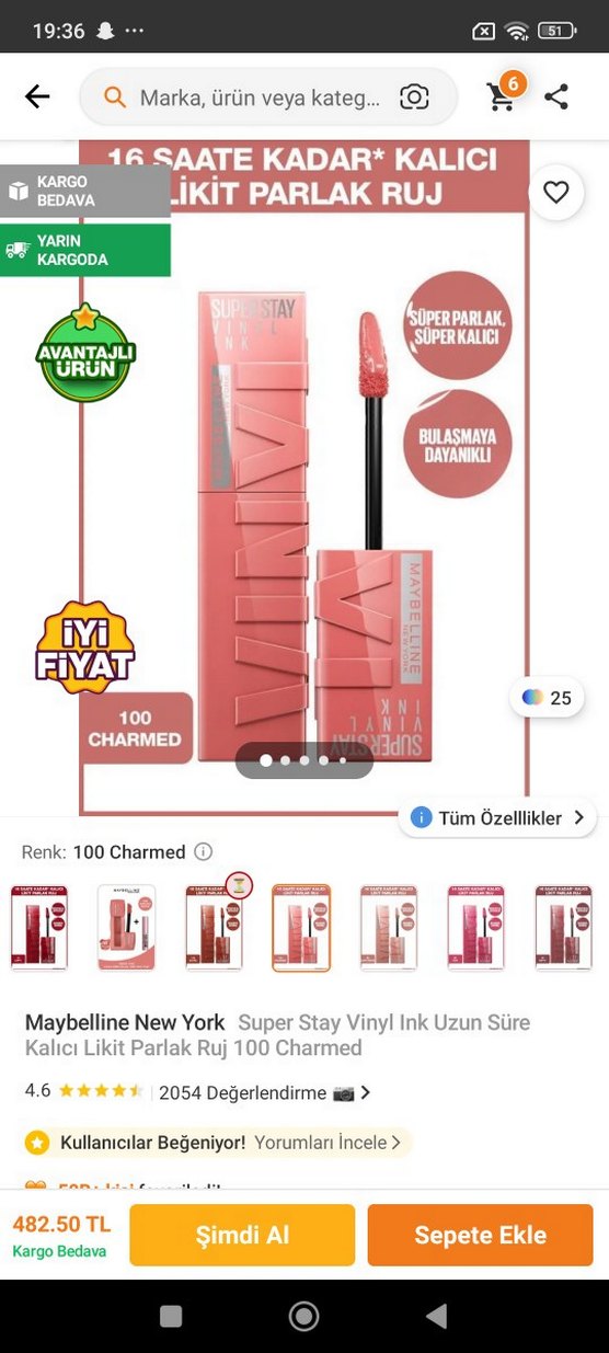 hediye olarak geldi ancak tenime uymadı sadece denedim ve kapattım Maybelline New York Super Stay Vinyl Ink 100 Charmed kalıcı, süper parlak ve bulaşmaya dayanıklı