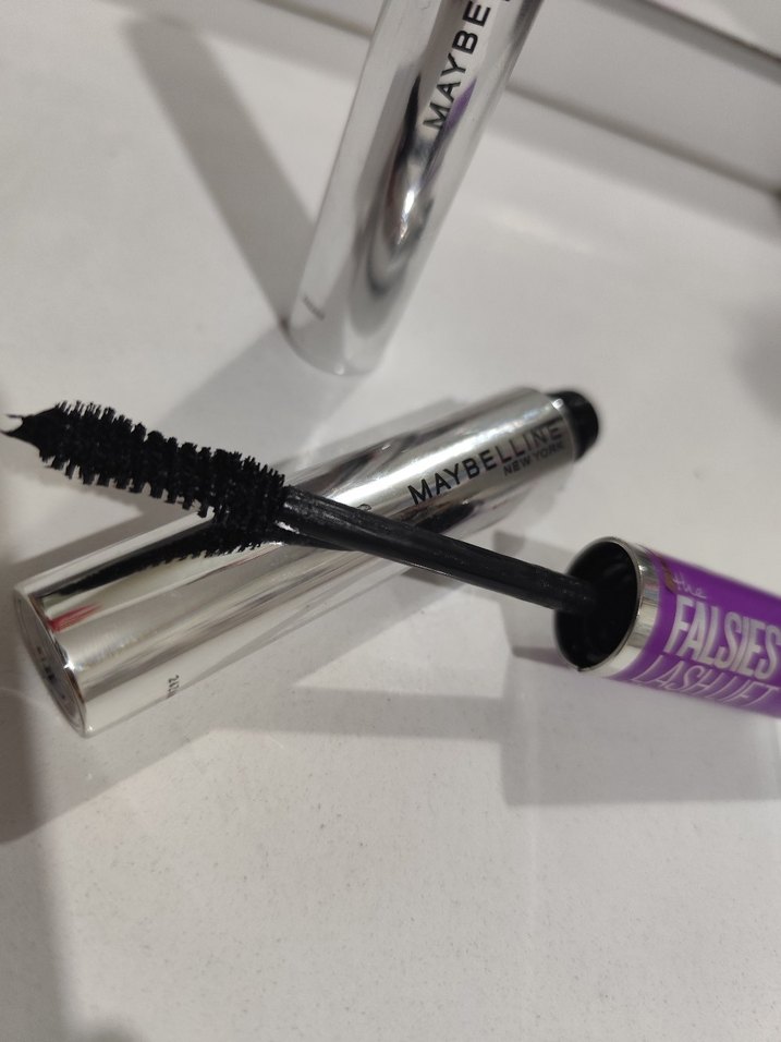 Maybelline markalı, parlak mor renkte, hacim veren fırçasıyla etkileyici kirpikler sağlayan maskara. Üzerinde 'FALSI' yazısı bulunur.