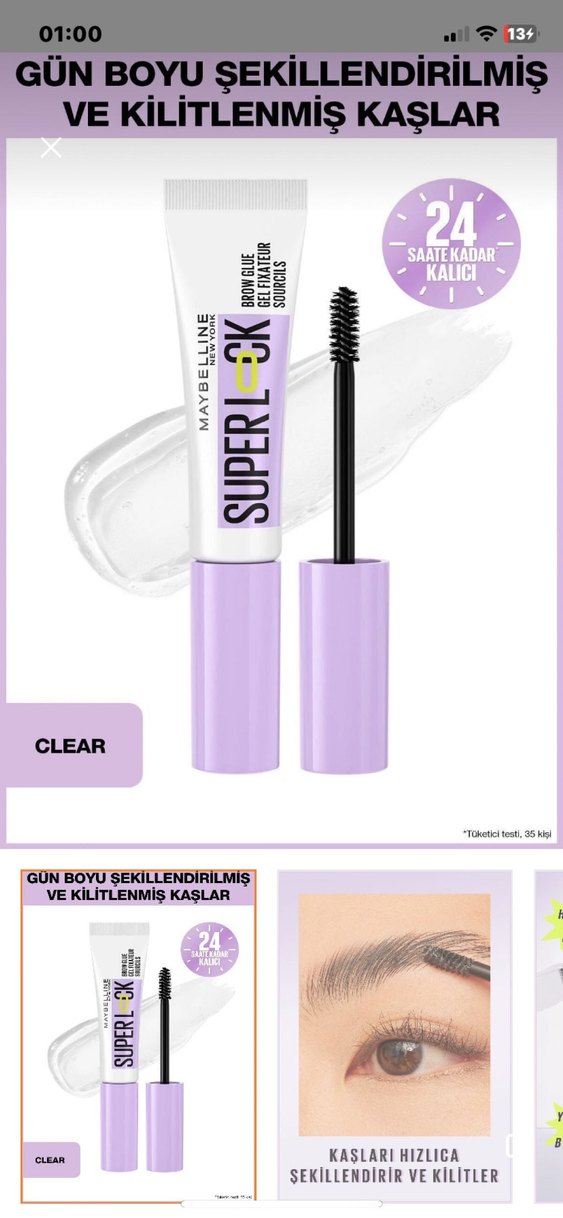 Maybelline Super-Clear mor maskara, kirpikleri 24 saate kadar şekillendirir ve kilitler. Gün boyu kalıcı ve belirgin kirpikler sağlar.
