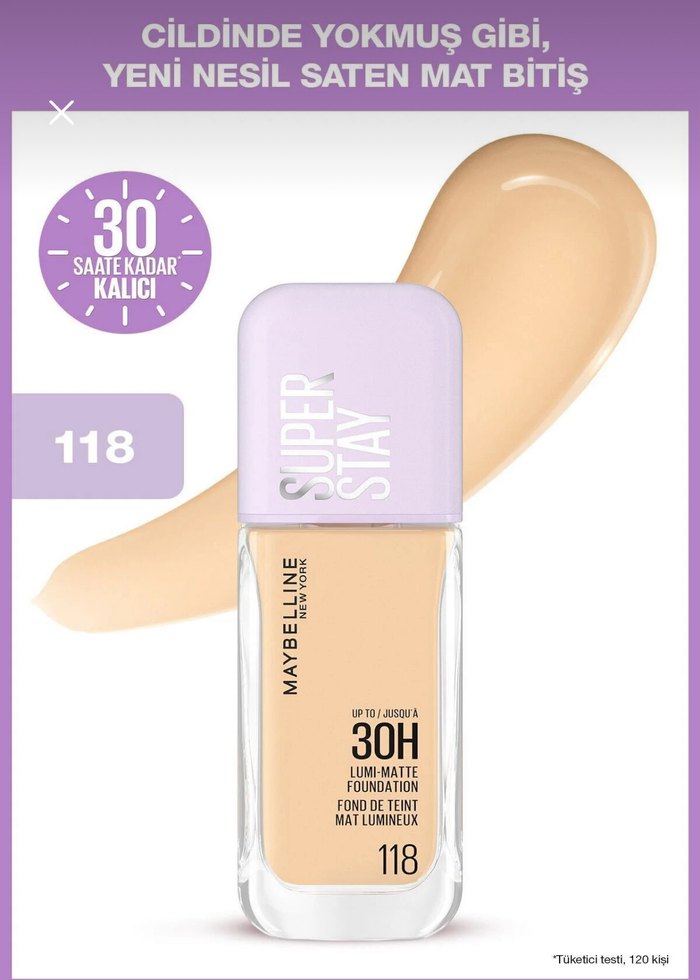 Maybelline Super Stay 118 Beige fondöten, ciltte yokmuş gibi hissettiren yeni nesil saten mat bitiş sunar. 30 saate kadar kalıcıdır.