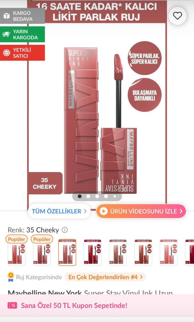 Maybelline Super Stay Vinyl Ink 35 Cheeky, süper parlak ve kalıcı kırmızı renk sunar. Bulaşmaya dayanıklı yapısıyla uzun süre kalır.