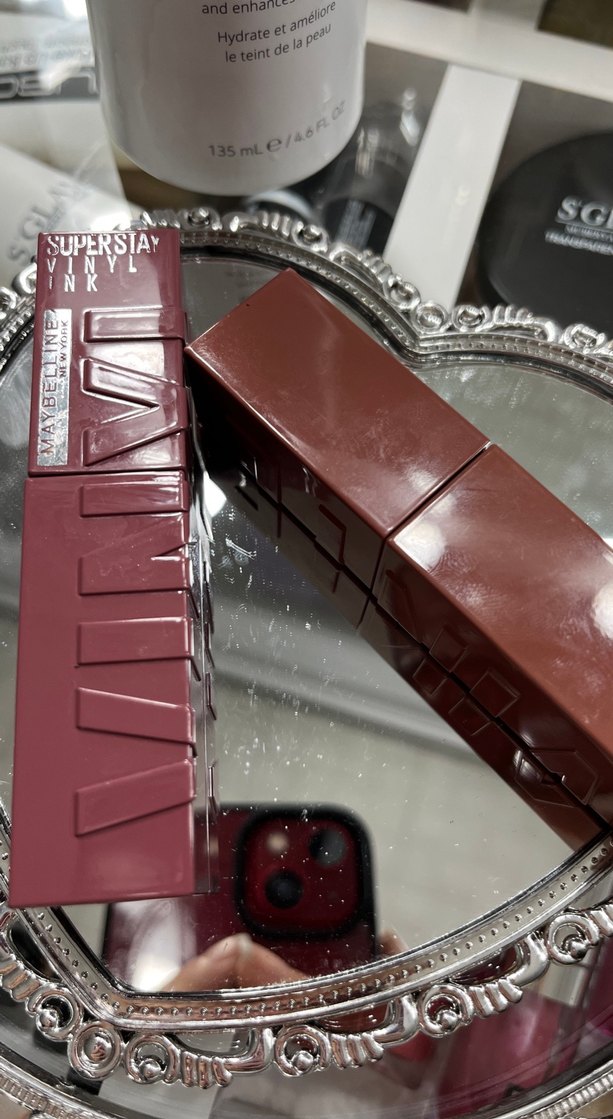 Maybelline Superstar Vinyl ruj, koyu bordo renginde, parlak ve yoğun renk sunar.