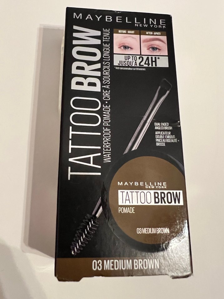 Maybelline Tattoo Brow orta kahverengi, 24 saate kadar kalıcı suya dayanıklı pomad formülü ve çift uçlu tasarımıyla hassas uygulama ve şekillendirme sağlar.Ambalajı açılmamıştır.İki adet almıştım.Biri fazla olduğu için satışta