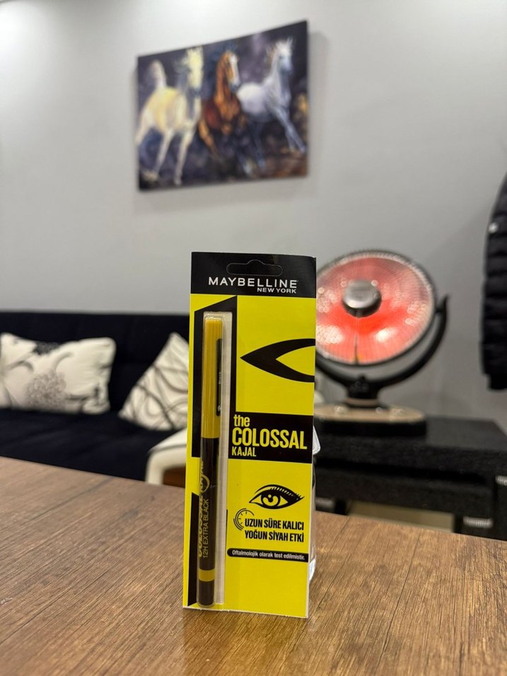 Maybelline The Colossal Kajal, uzun süre kalıcı yoğun siyah etki sağlar. Sarı ambalajı ürünün güçlü etkisini vurgular.