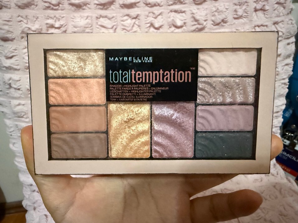 Maybelline Total Temptation göz farı paleti, parlak ve mat bitişli açık bej ve nötr tonlarda çeşitli renkler sunar. ✨