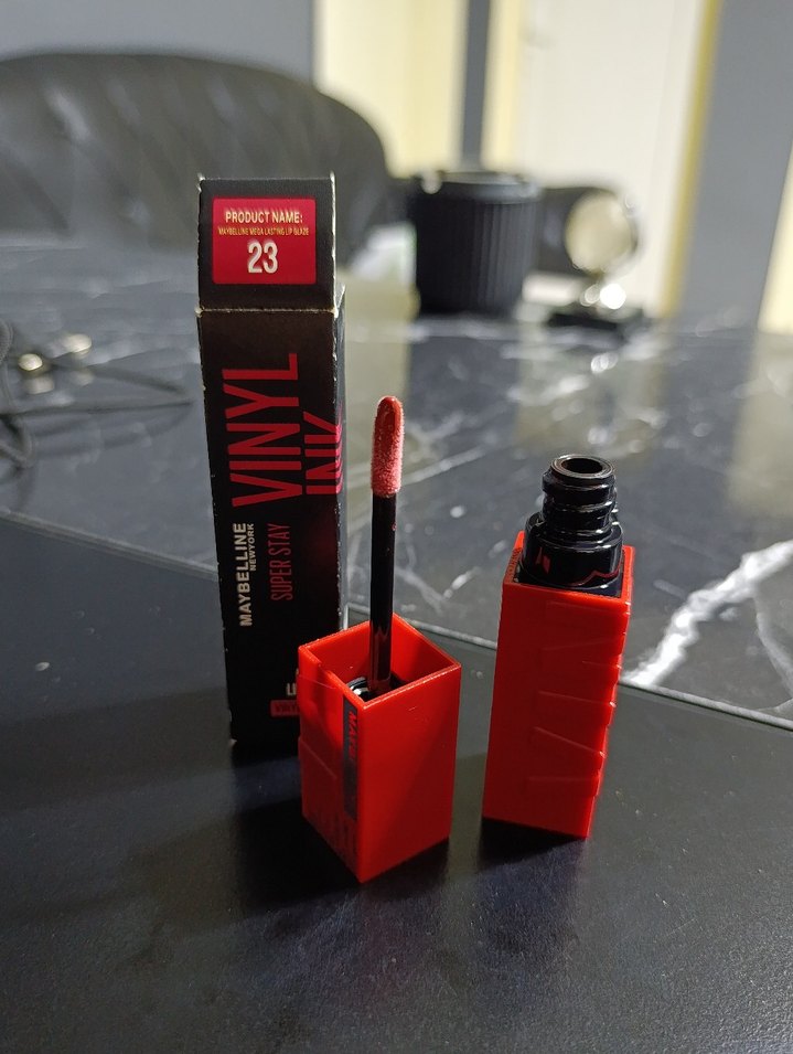 Maybelline Vinyl Ink likit ruj, 23 numaralı koyu kırmızı tonu ile canlı renk ve pürüzsüz uygulama sunar.