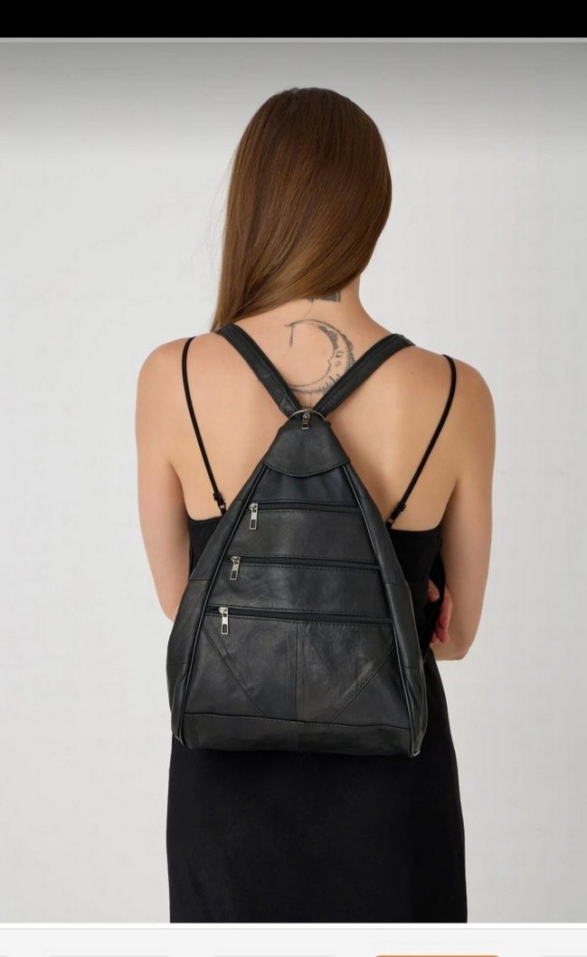 Siyah deri, minimalist biker tarzı kadının sırt çantası, çoklu fermuarlı cepleriyle günlük kullanıma uygun.