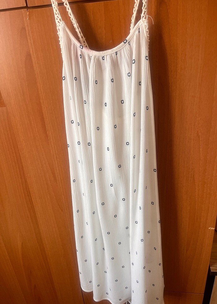 Arkası çapraz, içi hafif görünen bir kumaşa sahip rahat bir elbise. M beden hatta L beden rahatlıkla giyebilir. Bir kez giyildi.