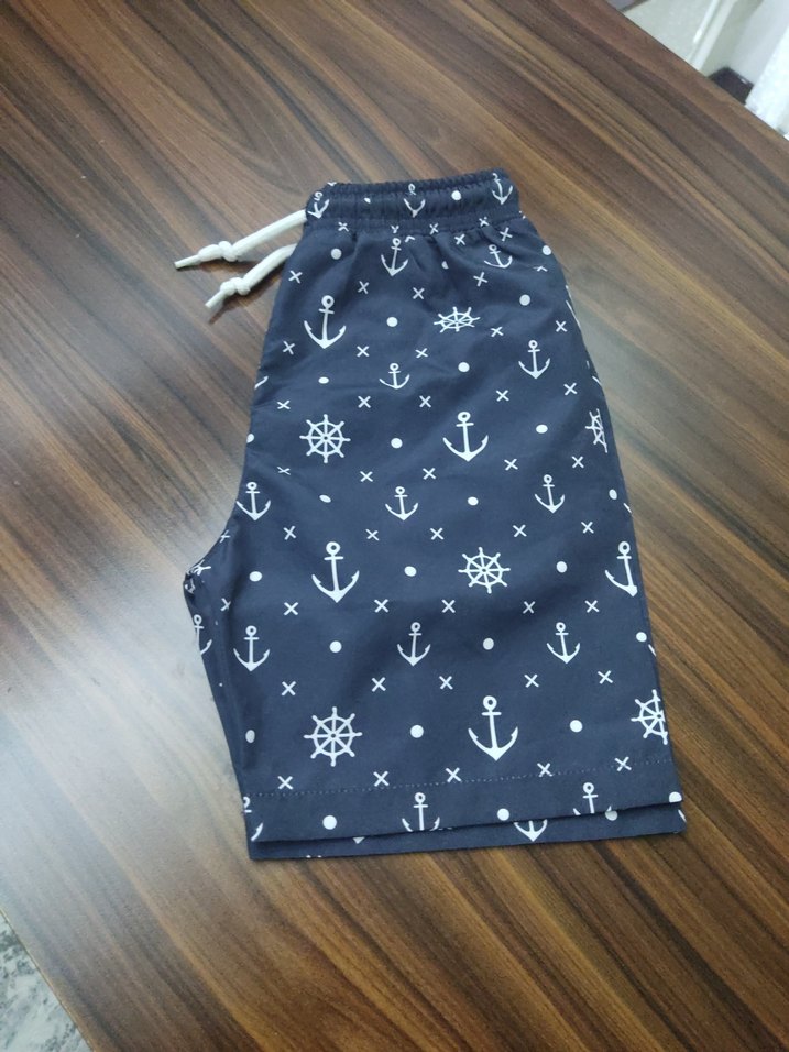 Lacivert ve gri denizci desenli, bol kesim ve elastik bel bantlı erkek mini deniz şortu. 5 6yas uygundur