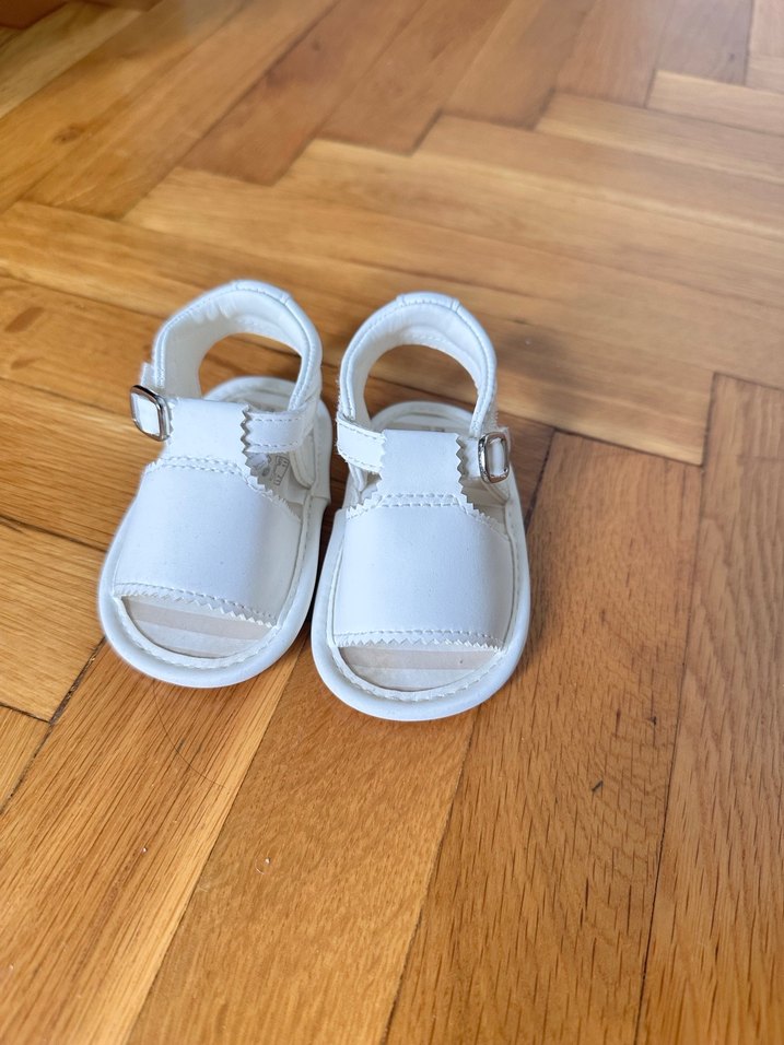 Parlak beyaz renkte, tokalı kayışlı, esnek ve rahat kauçuk malzemeden yapılmış kız bebek ilk adım ayakkabısı.