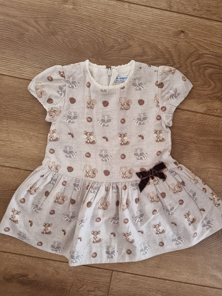 Bej renkli, kısa kollu kız çocuk elbisesi. Baskılı deseni, yuvarlak yakası ve fırfır detayları bulunur. Bohem tarzda, bol kesim ve küçük fiyonk süslemeli. 18 ay, 86 cm