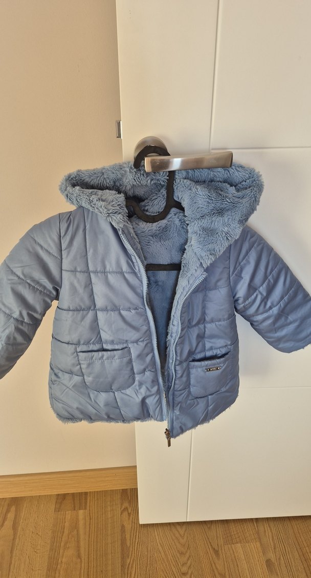 Tertemiz kusursuz durumda Mayoral marka çocuklar için mavi, içi yumuşak kürklü çift taraflı giyilebilen mont. 2 Yaş 92 cm