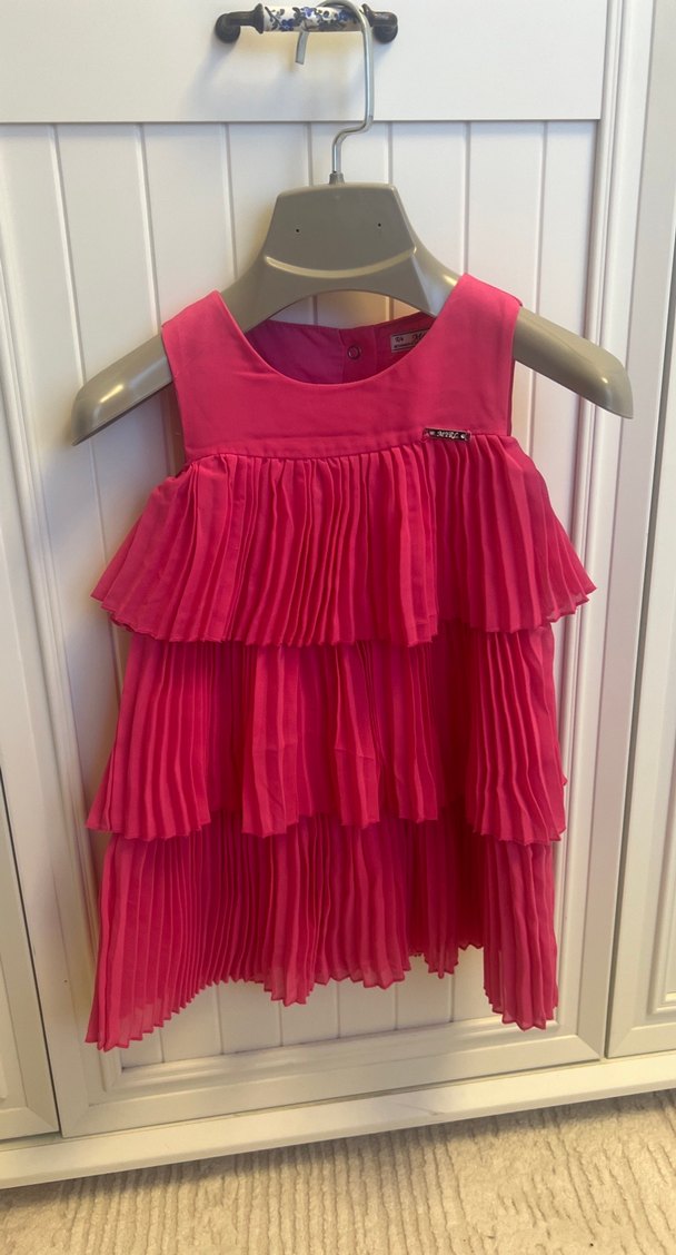 Kolsuz, pembe renkli elbise, pilili katmanlara ve bol kesime sahip. Düz, yumuşak sentetik kumaştan üretilmiştir. Normcore tarzında, yuvarlak yakalıdır.