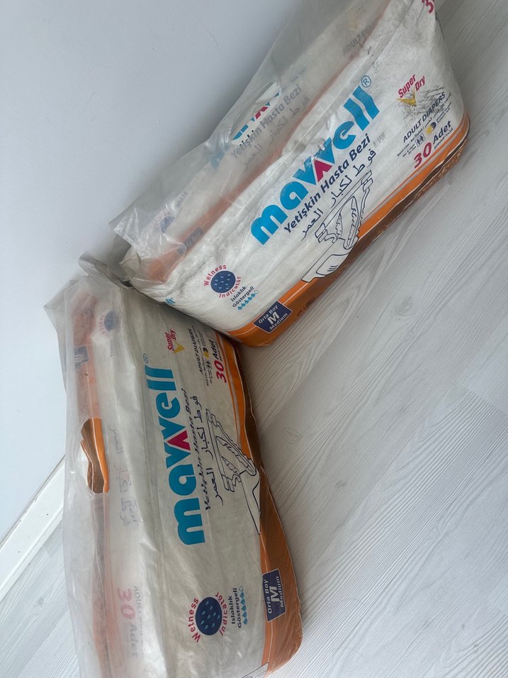 Orta boy M beden hasta bezi. 2 adet 30’lu paketlerde toplam 60 adet sıfır, açılmamış paket. Islaklık göstergeli. Süper kuruluk sağlar.