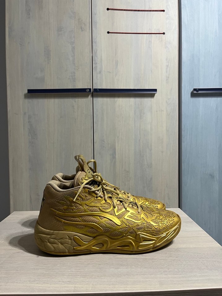 Altın renginde, parlak yılan desenli ve bağcıklı basketbol ayakkabısı. Kauçuk malzemeden, spor ve sokak stiline uygun.