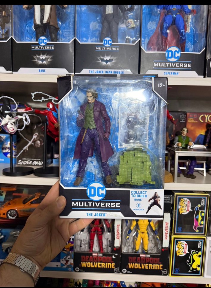 DC Multiverse The Joker aksiyon figürü, koyu renkli haki kıyafet ve detaylı aksesuarlarla. Bane yapımı parçaları içerir