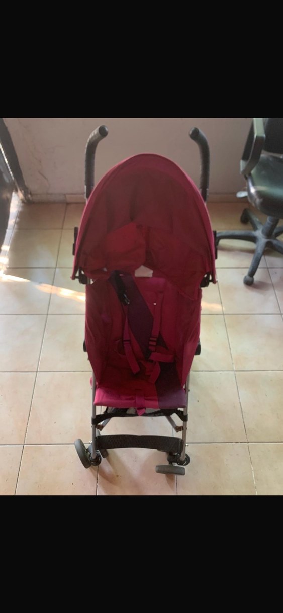 Bordo renkli bebek arabası, katlanabilir yapıda, tente ve güvenlik kemeri. Küçük tekerlekleri ve hafif iskeletiyle kolay taşınır.