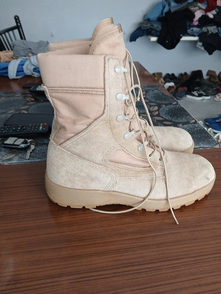 Bağcıklı ve kemerli bej süet erkek bot, rahat ve pastel tonlarda sokak stiline uygun outdoor tasarım.