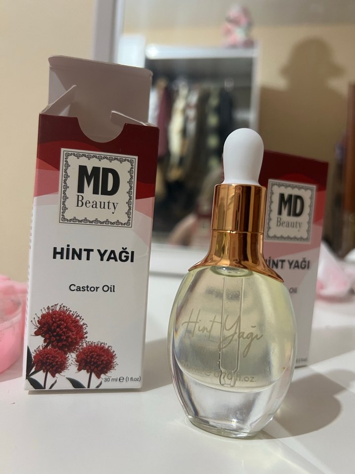 MD Beauty markasına ait 30 ml hint yağı, damlalıklı şişede ve kırmızı-beyaz kutuda sunulmaktadır.