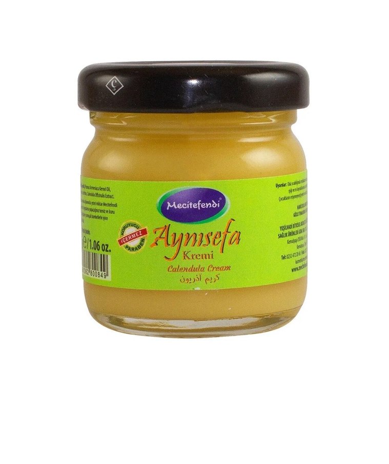 Mecitefendi Aynseta kremi, cilt besleyici ve yatıştırıcı etkili calendula özlü el kremidir. Cam kavanozda, siyah kapaklı.