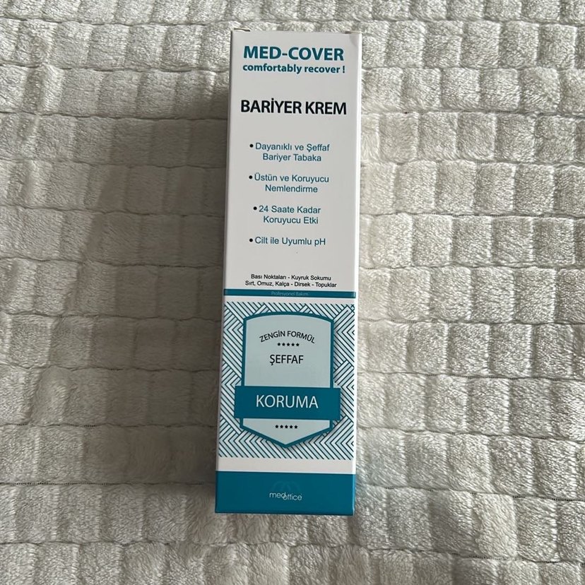 Med-Cover bariyer krem, dayanıklı ve şeffaf koruyucu tabaka sağlar, 24 saate kadar nemlendirir ve korur. Ciltle uyumlu pH ve zengin formüllüdür. Stok mevcut