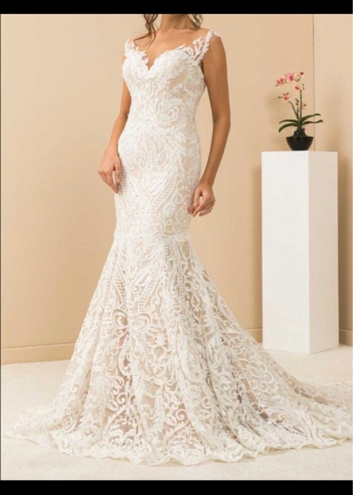 2 saat kullanıldı sadece 36 bedene uygun özel işçilikle yapılmıştır incilerle işlenmiştir Balık model kuyruklu üç kat kumaştan tasarlanmıştır kol tasarımı sonradan eklenmiştir istenilirse terzi yardımıyla çıkartılır çok şık zarif bir gelinlik modelidir elbise boyu 1 75 tir