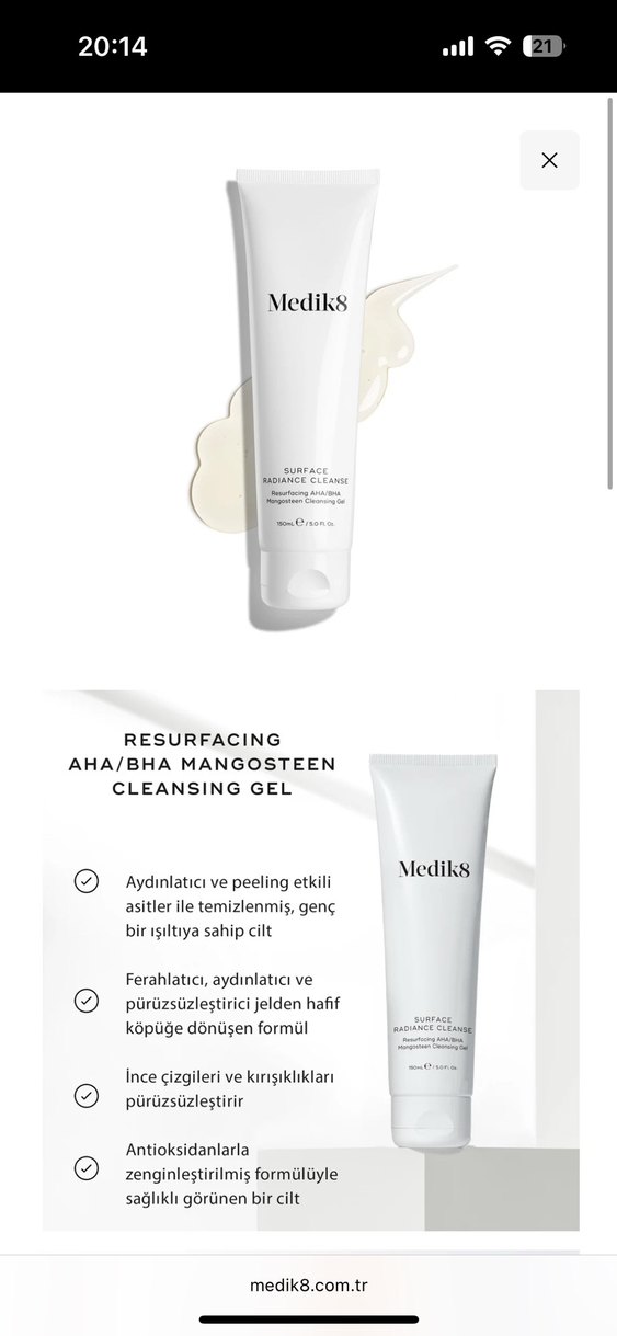Medik8 AHA/BHA Mangosteen Temizleme Jeli, asitlerle aydınlatıcı ve peeling etkili, hafif köpüğe dönüşen formülüyle cildi pürüzsüzleştirir, ince çizgi ve kırışıklıkları azaltır.