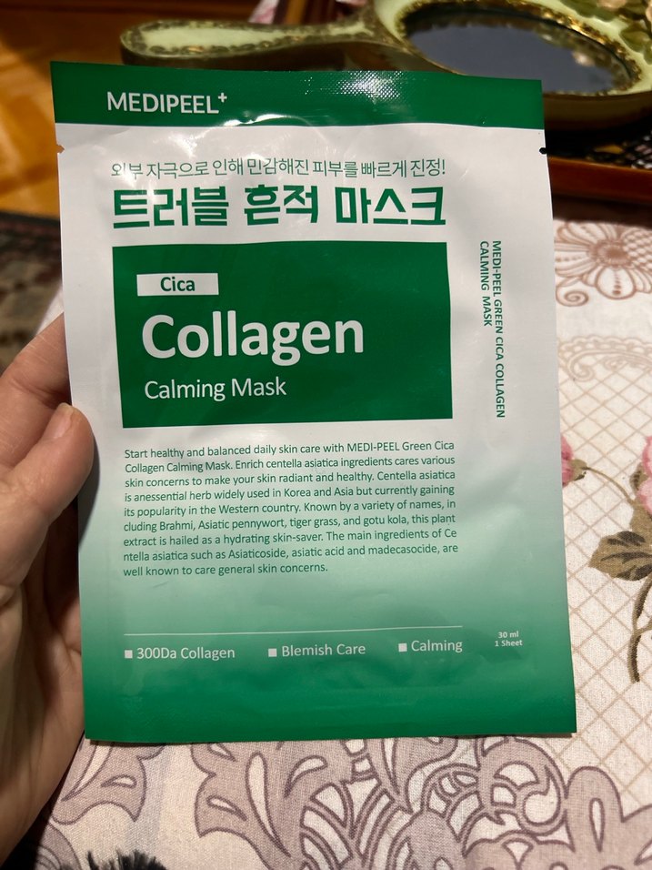 MEDIPEEL Cica Kolajen Yatıştırıcı Maske, 3000Da kolajen ve yatıştırıcı bileşenlerle cilt lekelerini sakinleştirir ve cilt dengesini destekler. Kore’den aldım