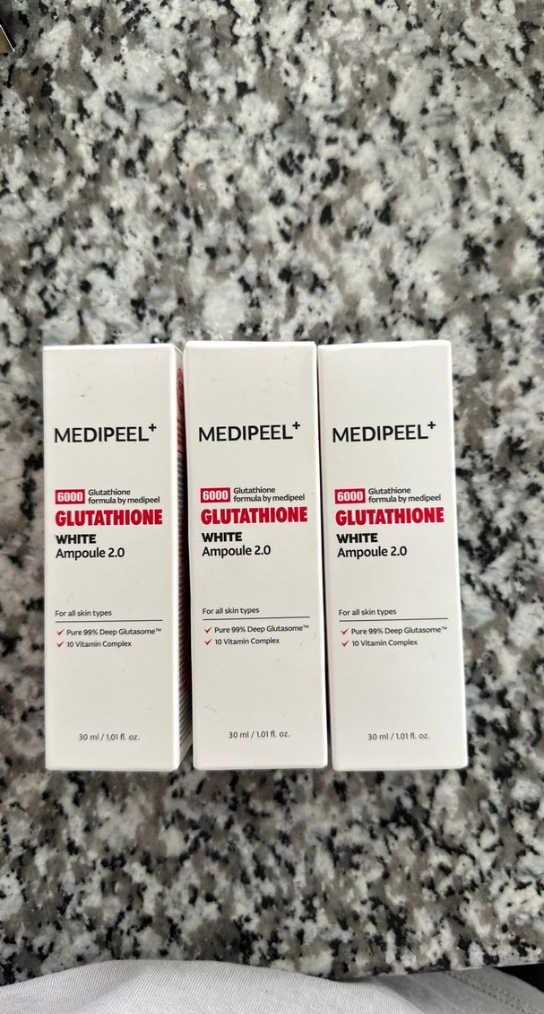 Medipeel Glutatyon Beyaz Ampul 2.0, 6000mg glutatyon ve vitamin kompleksi içeren, tüm cilt tiplerine uygun 30ml anti-aging serumu.