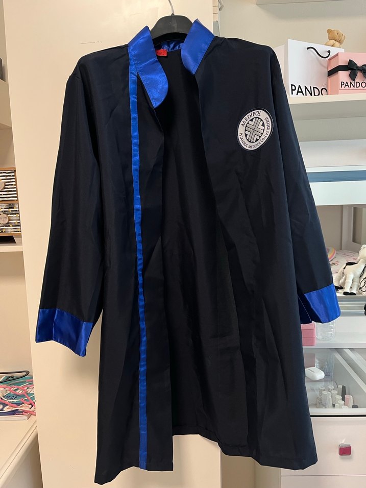 Medipol Üniversitesi baskılı 2025 mezuniyetine ait sadece bir kere giyilmiş cübbe ve kep temiz bir şekilde dolapta duruyor.