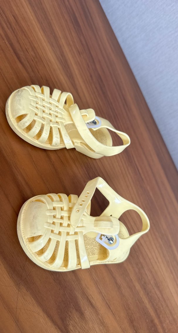 Pastel sarı renkte, tokalı bantlı, desen içermeyen bohem tarzda kız çocuk terliği.