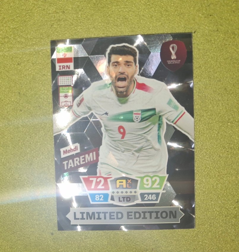 Altın tonlu bu erkek Mehdi Taremi'nin hareketli pozunu ve sınırlı üretim işaretlerini içerir, istatistikler ve IRN kodu yer alır. ⚽