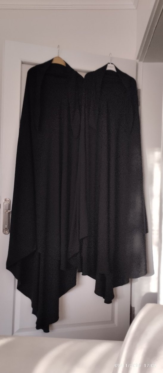 Kadınlar için siyah, uzun kollu, straplez yakalı, dökümlü ve bol kesim uzun pelerin. Ofis için uygun gotik tarzda, ipeksi kumaştan üretilmiştir.