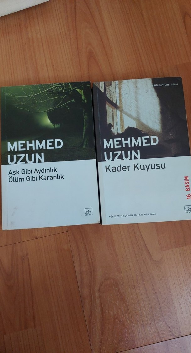 Mehmed Uzun'un 'Kader Kuyusu' ve 'Aşk Gibi Aydınlık, Ölüm Gibi Karanlık' adlı kitapları, edebi temalı fotoğraflarla kaplanmış iki eserdir.