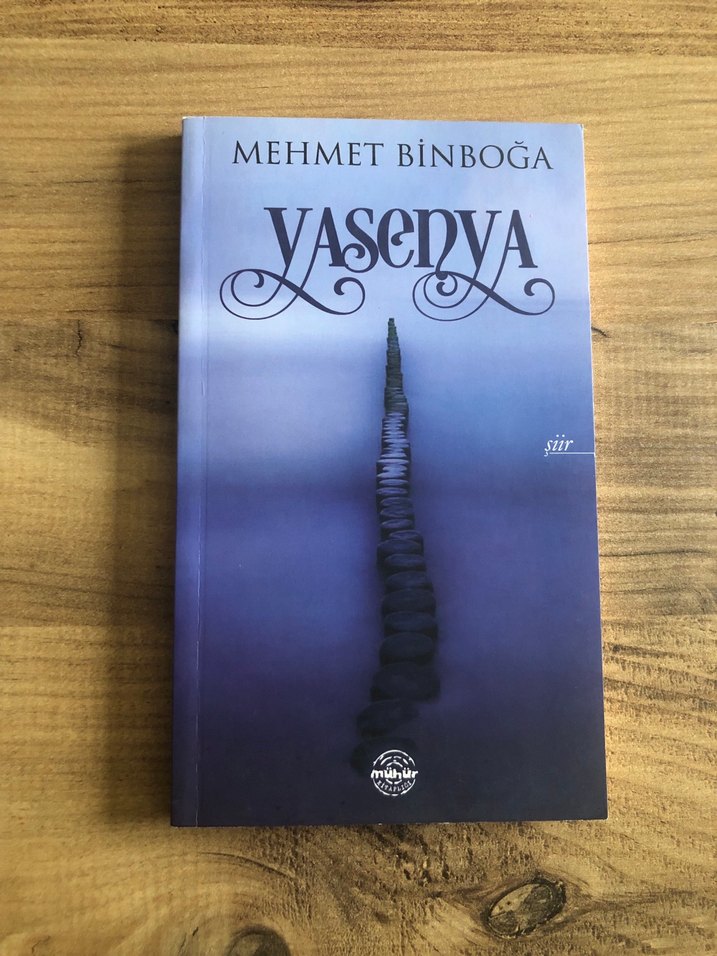 Mehmet Binboğa'nın "Yasenya" adlı şiir kitabı, sakin mavi tonlarda ve dikey taş yolu illüstrasyonuna sahip kapak ile sunuluyor.