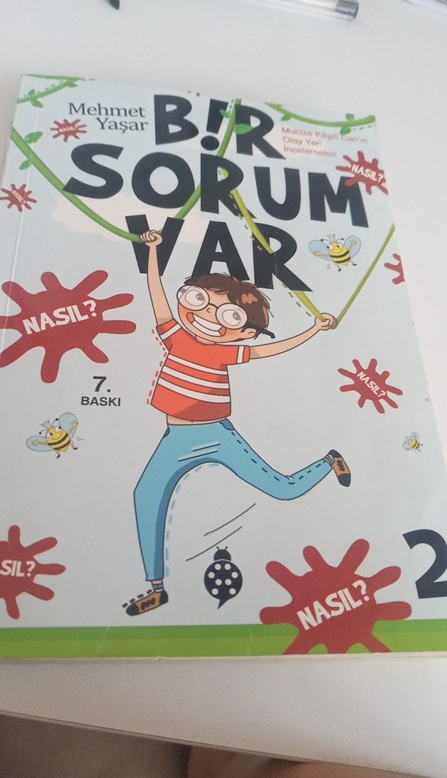 Mehmet Yaşar imzalı 'Bir Sorum Var' çocuk kitabı, eğlenceli kapak tasarımıyla merak uyandırıyor. Nasıl? Sil? gibi sorular içerir. Baş kapağında ismim yazdığı için onu karalamak zorunda kaldım çıkmıyordu .Son fotoğraftada görüldüğü gibi kitabın altında 2 tane sarı nokta vardır.