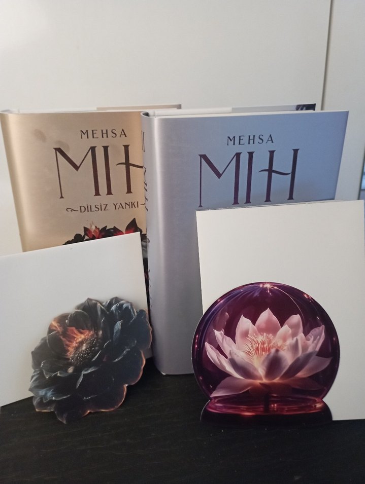 Mehsa'nın "Dilsiz Yankı" romanı, farklı kapak tasarımlarına sahip iki baskı ve çiçek temalı dekoratif ayraçlarla birlikte sunuluyor.