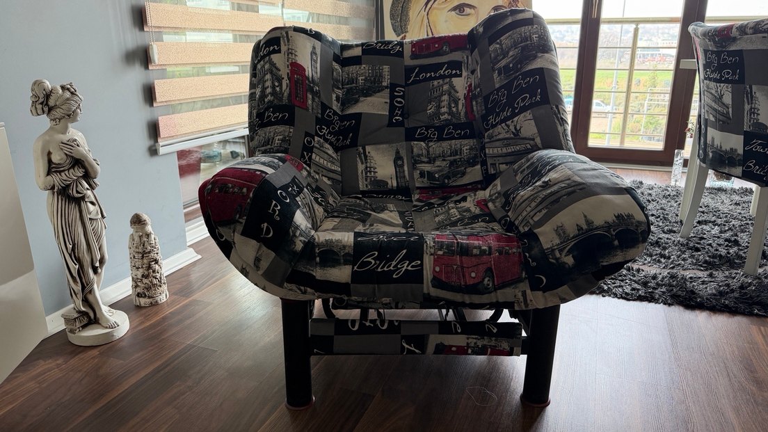 Mekanizma – sessiz ve sorunsuz çalışır. Tam açılır, yatak gibi kullanıma uygundur. Ergonomik sırt ve geniş oturum alanı Tok dokulu, çökme yapmayan kumaş Formunu koruyan sünger yapısı Dekoratif desenli kumaşıyla bulunduğu mekâna karakter katar; salon, okuma köşesi veya özel dinlenme alanları için idealdir. Temiz kullanılmıştır, kusuru yoktur. Koltukta bulunan ayak uzatma mekanizması sayesinde tamamen açılarak yatak pozisyonu alır. Uzun süreli oturumlar, dinlenme ve uyku için oldukça rahattır.