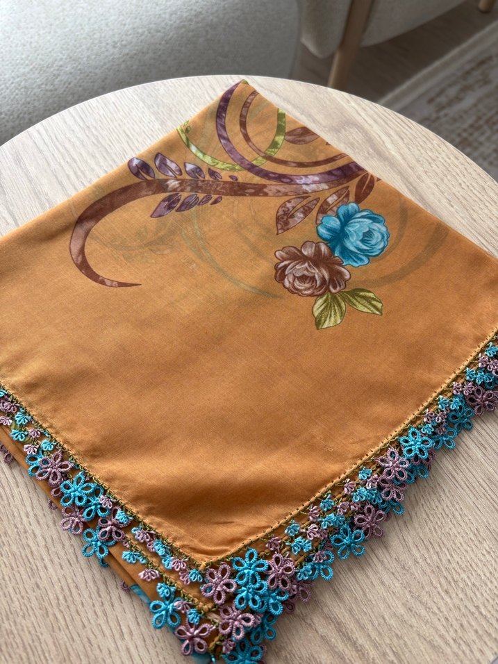Hardal sarısı başörtüsü konvansiyonel stilde mekik detayları ve parlak yüzeye sahip. Çiçek desenleriyle bohem ve retro havası veriyor.