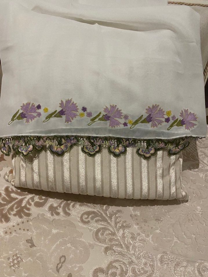 Pastel renklerde çiçek nakışlı ve dantelli beyaz zarif bir dekoratif detay sunar.
