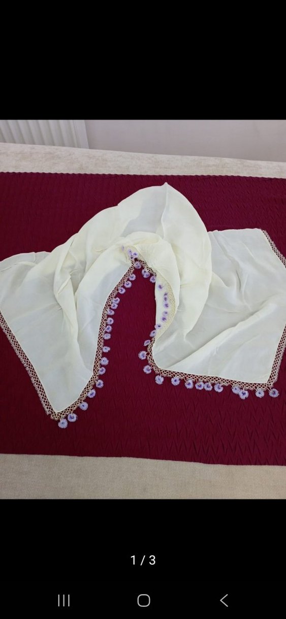 iHiç kullanılmadı ipeksi dokulu fular, veya namaz örtüsü olarakda kullanılabilecek küçük çiçekli dantel kenar detaylarıyla bohem ve retro tarzını yansıtıyor. Hafif ve yumuşak dokusuyla şıklık katıyor.