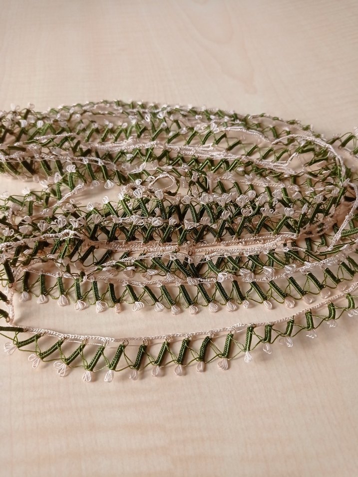 Yeşil renkte, gri tonlarda avant-garde detaylara sahip bohem tarzda mekik oyası 4 metredir çok düzgün örülmüştür