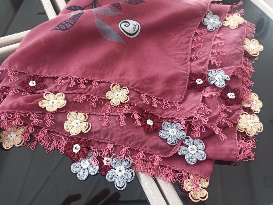 Bordo renkte, dantel işlemeli kenarları ile çiçek desenli kadın fular. Bohem ve retro tarzlara uygun tekstil kumaştan yapılmıştır.