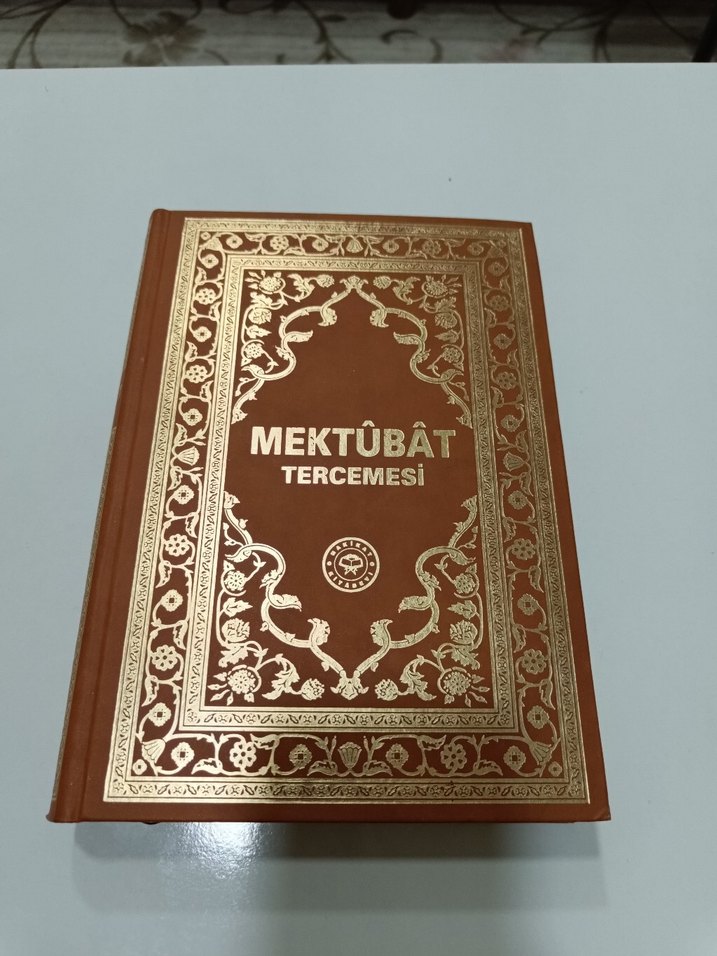Mektubat Tercemesi adlı kitap, kahverengi kapağı ve altın süslemeleriyle dikkat çeker. Dini mektuplar ve tercümeleri içerir.