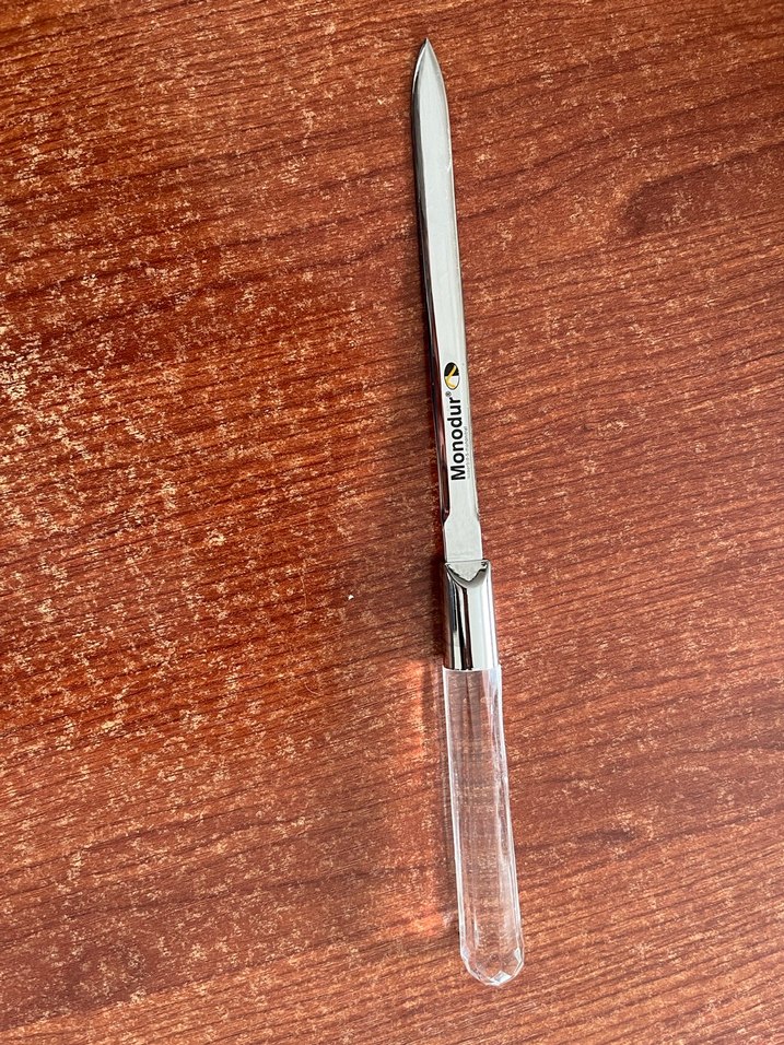 Şeffaf saplı, mektup açacağı. Ölçülü fotoğraf konmuştur.